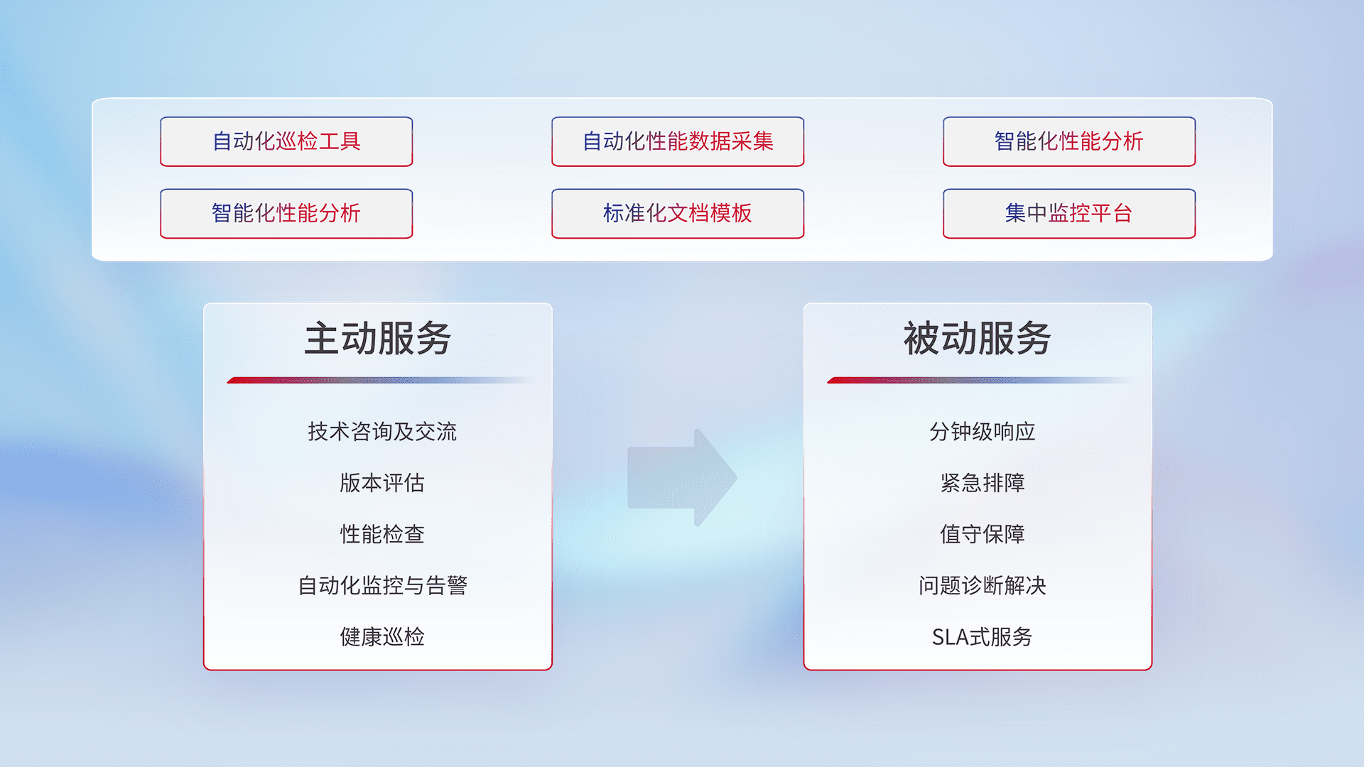 智能化工具和标准化文档,,,,保障服务质量,,,,提供主动服务(包含技术咨询、、、、版本评估、、性能检查、、自动化监控与告警、、、健康巡检)和被动服务包含(分钟级响应、、、紧急排障、、、值守保障、、、问题诊断解决、、、、SLA服务)。。